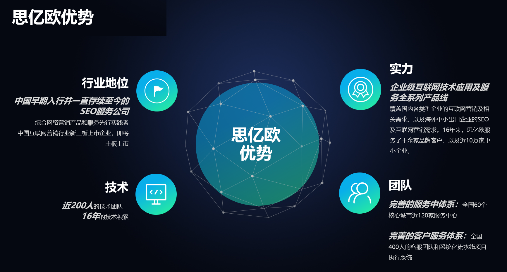 公司現共有員工1000余名,在全國各個重點城市設有100余家思億歐分公司和核心渠道商。16年來,思億歐服務了千余家品牌客戶,以及近10萬家中小企業。