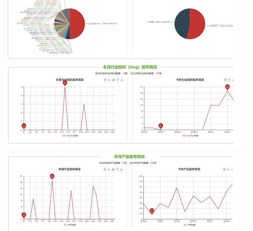該客戶選擇的是外貿快車超級版A套餐,目前已合作2年,網站總達標天數701天。zui新排名在谷歌首頁的關鍵詞數量為1204個。客戶很注重網站更新及運營情況,4月份,客戶共計更新高質量內容的產品71個,新聞15條,行業知識13條,平時基本會維持在每月更新30-40個優質產品。在這么多高質量的頁面帶動下,網站的日均流量可達到1500個以上,共計帶來1268個詢盤(不包含直接發郵件至郵箱的詢盤)。